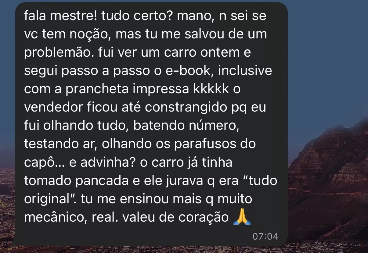 Não é só teoria: você vai ter o mesmo checklist usado por quem compra carros todos os dias. E suporte direto para não errar em nenhuma análise.